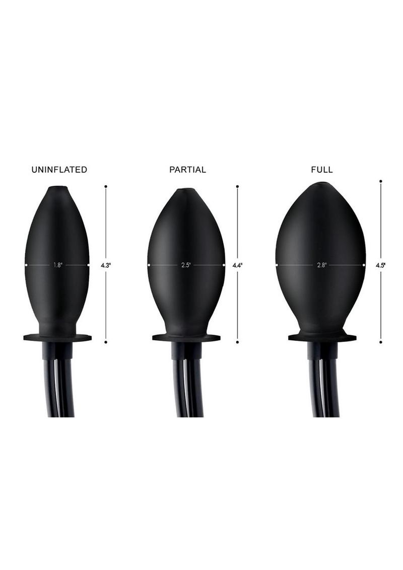 This butt plug has a rubber tube running through it. Fluids can pass through while it is inflated! Once the plug is inserted and inflated the large rubber hose can be hooked to an enema bag. When the time comes to administer the enema, the fluid will flow through the enema butt plug into the colon. The inflatable plug prevents pushing out the plug and the enema until the desired time arrives. Inflates by means of a bulb with release valve.