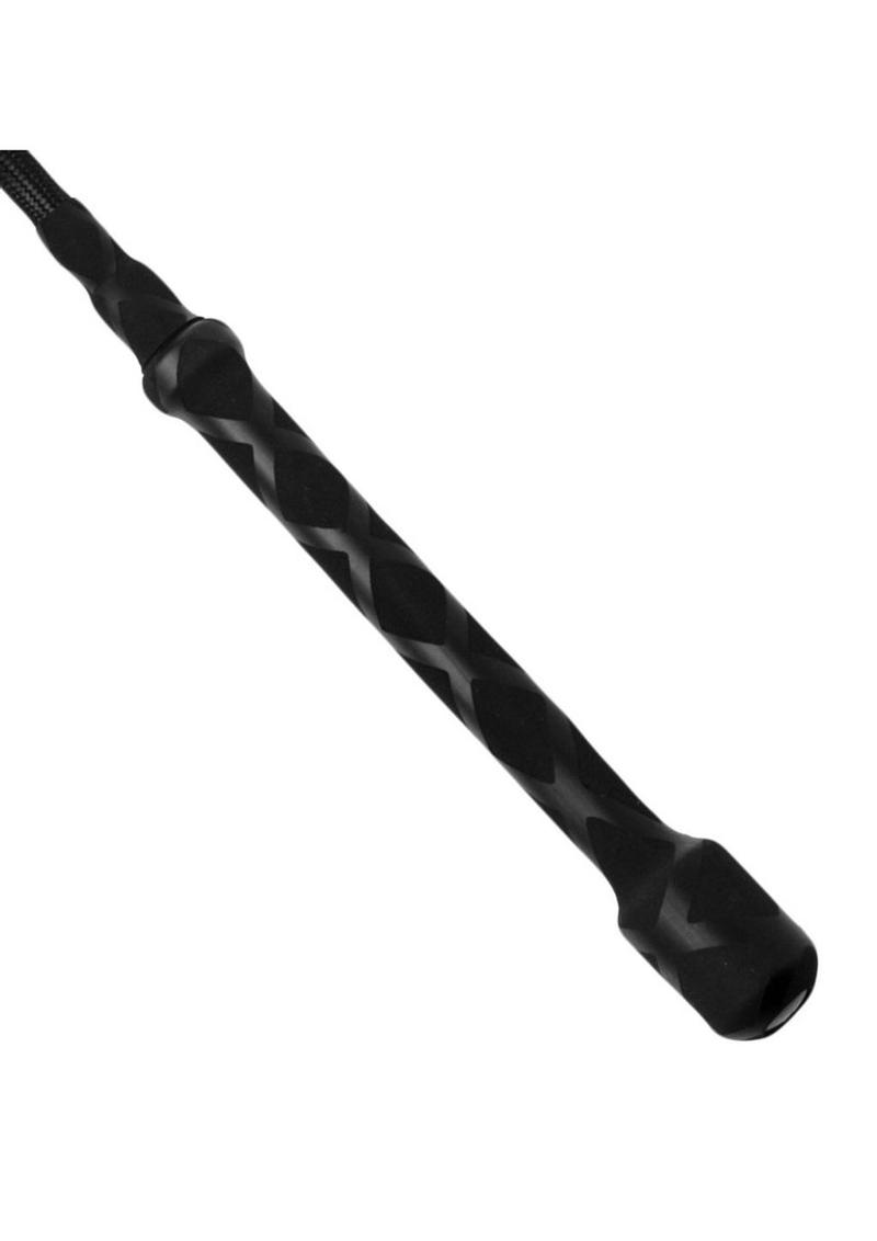 A good crop is an indispensable Dom staple. The classic design of this short riding crop is accented with attractive detailing on the rubber handle. Crisscrossed with elegant corset-style bands, the black contrast stripes enhance the visual appeal as well as your grip. The springy shaft is made of durable plastic covered with woven fabric. The genuine leather tip is a rounded paddle shape, bound in place with black thread.