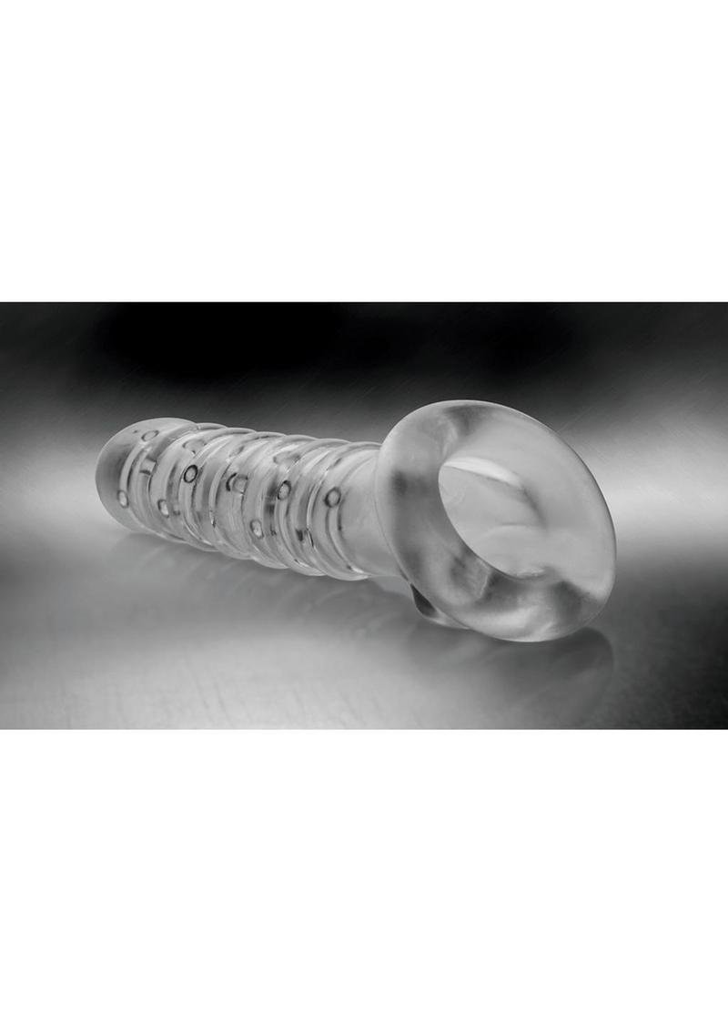 Add length and girth to your erection with a textured enhancement sleeve! Penetrate your partner with a bigger dick when you slide into the stretchy extender, nubbed and ribbed internally for your intense pleasure. As you thrust into your lover, you will feel the delightful friction inside, while the external ribbing massages their hole. The ball strap feature includes a stretchy opening for your scrotum to fit through, keeping this phthalate-free sleeve in place and adding extra sensation. Clean with mild soap and warm water. Safe for use with both water-based and silicone lubes.